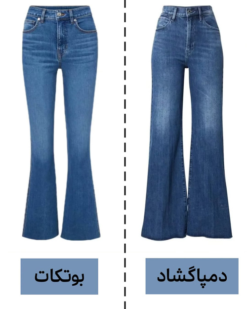 شلوار دمپا گشاد در ناحیه ران و زانو جذب است و از زانو به پایین گشاد میشود و ظاهری کلاسیک دارد. بوتکات مشابه دمپا گشاد است اما گشادی آن ملایمتر است و به راحتی با بوت یا نیمبوت ست میشود و پاها را کشیدهتر نشان میدهد.