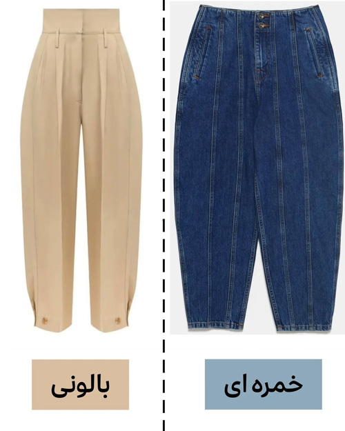 شلوار بالونی در قسمت ران و باسن بسیار آزاد و پفدار است، اما در مچ پا جمع میشود و حالتی هنری و خاص دارد. شلوار خمرهای بین راسته و بالونی است، در قسمت بالا کمی آزاد و به سمت مچ پا جمعتر میشود و ظاهر هوشمندانه و مناسبی برای موقعیتهای نیمهرسمی ایجاد میکند.