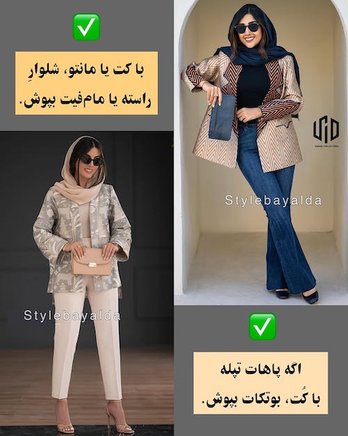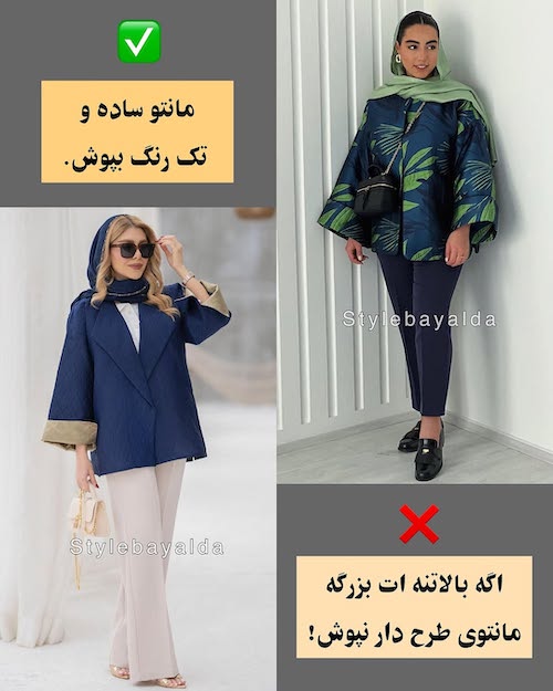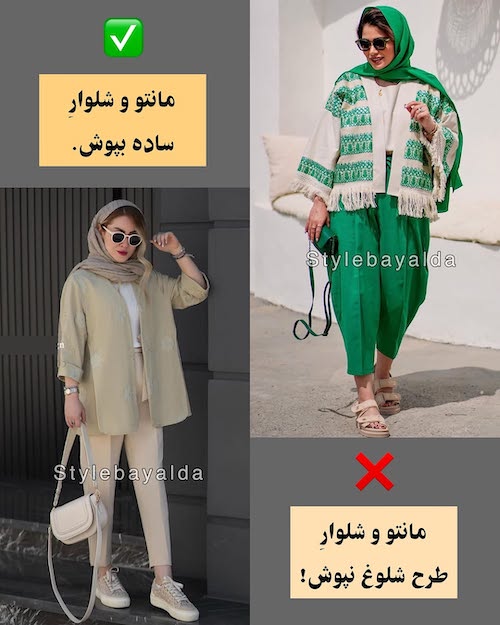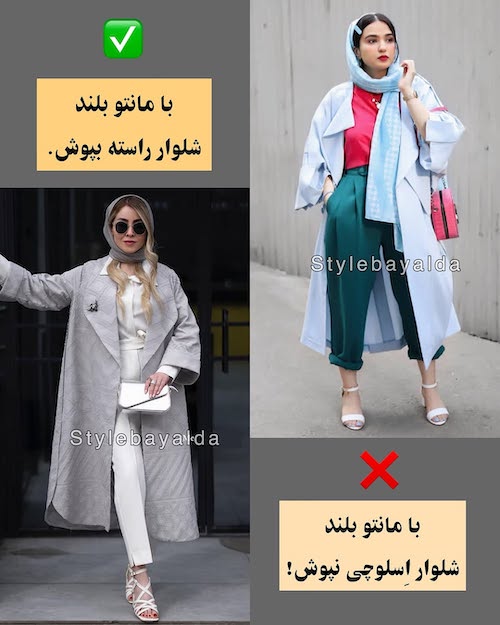 استفاده از شلوارهای اسلوچی (با حالت جمعشده در مچ) در ترکیب با مانتوی بلند، موجب بههمریختگی فرم پایینتنه میشود، در حالی که شلوارهای راسته در کنار مانتوهای بلند، به تناسب و انسجام استایل کمک میکنند.