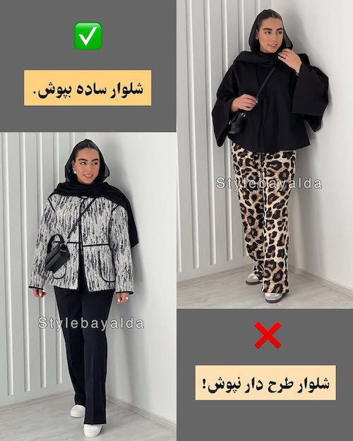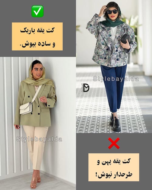 ستهای دارای طرحهای شلوغ و رنگهای متنوع، موجب اغتشاش بصری و بزرگتر دیده شدن فرم بدن میشوند. انتخاب مانتو و شلوار ساده، بهویژه در رنگهای ملایم و خنثی، ظاهری کلاسیک، آراسته و متعادل به همراه خواهد داشت.