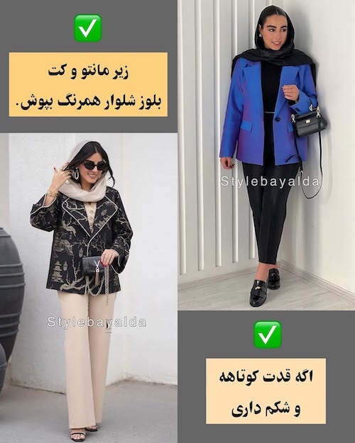 پوشیدن بلوز و شلواری با رنگ یکسان در زیر کت یا مانتو، باعث ایجاد پیوستگی بصری در اندام میگردد و ظاهر فرد را کشیدهتر نشان میدهد. این ترکیب، علاوه بر افزایش هماهنگی در استایل، موجب آراستگی و تناسب بیشتر ظاهر میشود و برای بانوانی که قد کوتاه و شکم برجسته دارند، مناسب است.