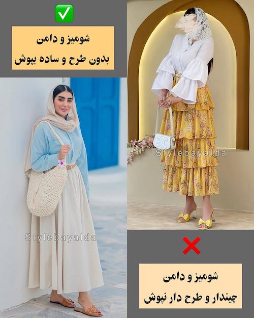 دامنهای دارای چین و نقشهای شلوغ، حجیمتر دیده میشوند و بر ناحیهی پایینتنه تأکید دارند. در عوض، انتخاب شومیز و دامن ساده و بدون طرح، ظاهر را کلاسیکتر و متعادلتر نمایش میدهد.