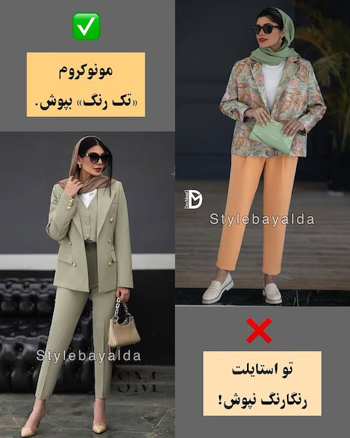 پوششهای مونوکروم (تکرنگ) باعث ایجاد انسجام در ظاهر شده و در کشیدهتر جلوه دادن قامت تأثیرگذارند. در مقابل، استفاده از رنگهای متنوع و متضاد ممکن است موجب برهم خوردن تناسب بصری اندام گردد.