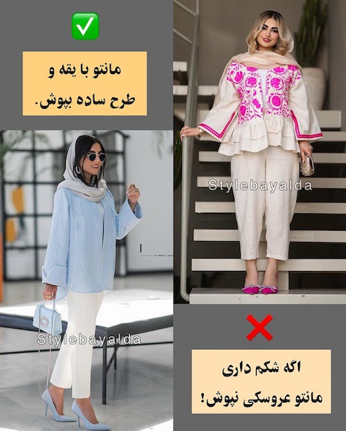 مانتوهایی با نقش و نگارهای شلوغ و درشت، سبب بزرگتر جلوه دادن نیمتنه بالایی میشوند. انتخاب مانتوهایی با رنگهای خنثی یا تیره و طراحی ساده، به ایجاد جلوهای مرتب و متناسب کمک خواهد کرد.