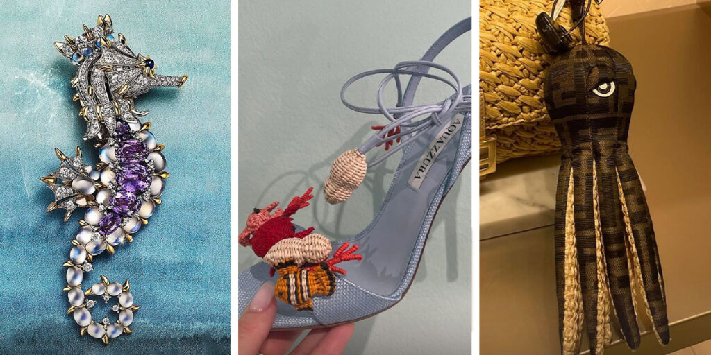 جواهرات با الهام از بافت مرجان، ترکیب فلز و مروارید و گوشوارههای بلند با الهام از شاخکهای عروس دریایی، مرز بین طبیعت و هنر مدرن را محو کردهاند. حتی در طراحی کفشها نیز از نقشمایههایی همچون صدف و پوستههای دریایی استفاده میشود، بهخصوص در صندلهای تابستانی و کفشهای پاشنهبلند فانتزی که پاشنهشان با فرم موجودات دریایی تزئین شدهاند.