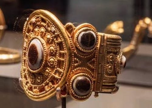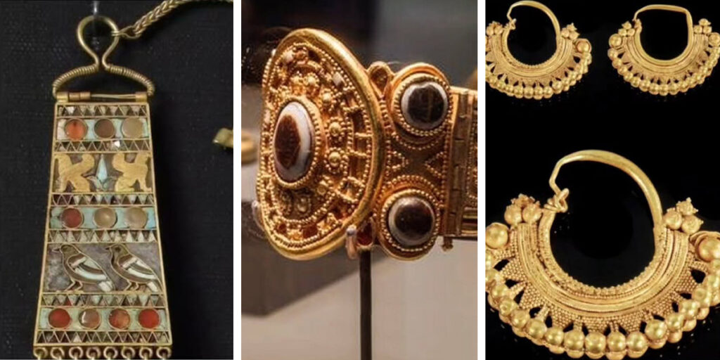 دستبندهای پهن و بازوبندهای طلایی که به شکل کاف یا حلقهای طراحی میشدند، اغلب با نقشهای برجسته و گاهی سنگهای قیمتی تزئین شده بودند.