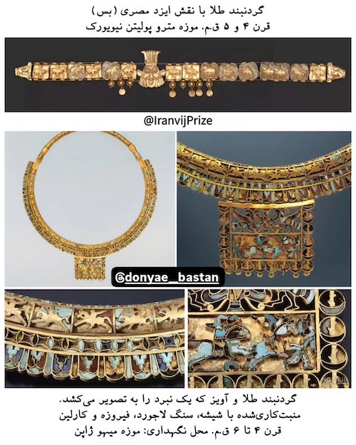 گردنبندهای طلایی با آویزهای سنگی یا میناکاری شده، یکی از زیباترین جواهرات هخامنشی است. این گردنبندها اغلب از زنجیرهای ریز و منظم ساخته میشدند و آویزها به شکل گل، حیوانات یا طرحهای هندسی بودند.