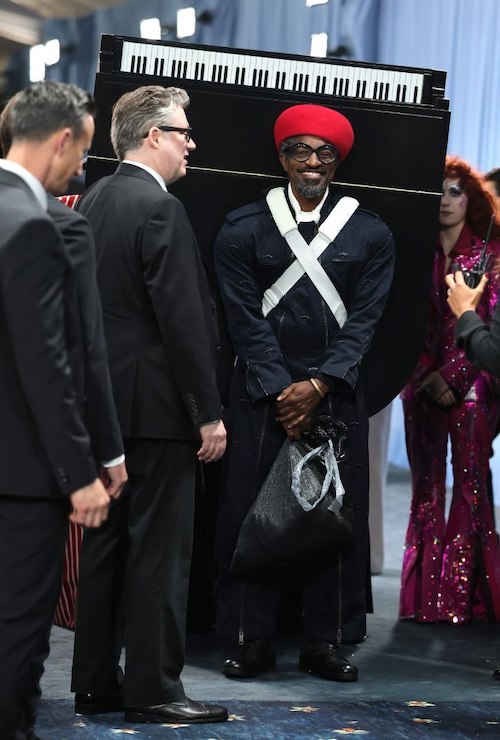 این هنرمند ۴۹ ساله، با نام اصلی آندره بنجامین، لباسی از برند «بربری» (Burberry) به تن داشت که با همکاری برند سابق او، «بنجامین بیکسبی» طراحی شده بود. استایل او شامل یک جامپسوت سرمهای زیپدار، کلاه قرمز و کیسه زبالهای در دست بود. پیانویی که به پشت او بسته شده بود، نسخهای کوچکتر از مدل Steinway Model S بود که توسط شرکت طراحی «گنجشک صورتی» (Pink Sparrow) از فوم، چوب لوآن و قطعات چاپ سهبعدی ساخته شده و تنها ۳۰ پوند وزن داشت.