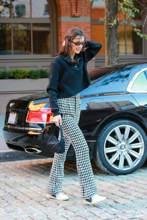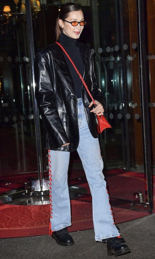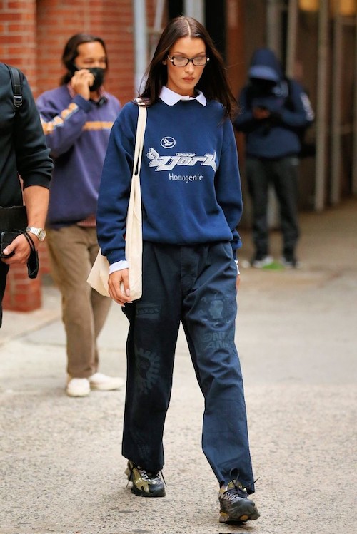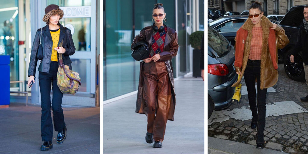 او علاقهی خاصی به کتهای چرمی اورسایز و البته کراپکتها دارد که اغلب با شلوارهای وایدلگ یا بوتهای بلند ترکیب میشوند. این آیتمها معمولاً در رنگهای کلاسیک مانند مشکی، قهوهای و بژ دیده میشوند و نشاندهندهی علاقهی او به ظاهرهای شیک و کاربردی هستند. عینکهای آفتابی وینتیج، کیفهای کوچک و اکسسوریهای ساده از جمله جزئیاتی هستند که در تیپهای او تکرار میشوند و به استایلهایش جذابیت بیشتری میبخشند. یکی دیگر از آیتمهای پرتکرار در استایلهای بلا حدید، پلیورهای یقهدار و ژاکتهای بافتنی هستند که اغلب زیر کتهای چرم یا پافرهای او پوشیده میشوند و استایلهایی لایهلایه میسازند. بلا در عین حفظ المانهای کلاسیک، با ترکیب رنگها و طرحهای جسورانه و استفاده از قطعات وینتیج، به نوعی استایل منحصر به فرد و الهامبخش دست پیدا کرده که هم خاص و هم کاربردی است.