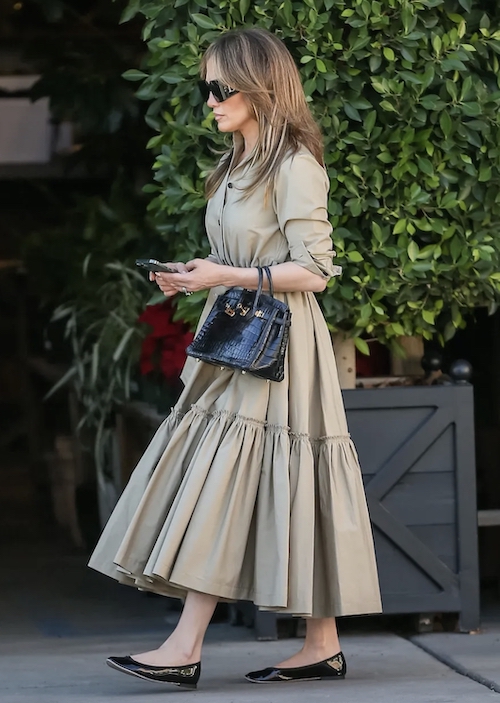 جنیفر لوپز در لسآنجلس با استایلی خنک و راحت دیده شد: پیراهن بلند خاکیرنگ، کیف مشکی از برند «هرمس» و کفشهای بالهی مشکی. این ترکیب برای فعالیتهای روزمره و خرید مناسب است.