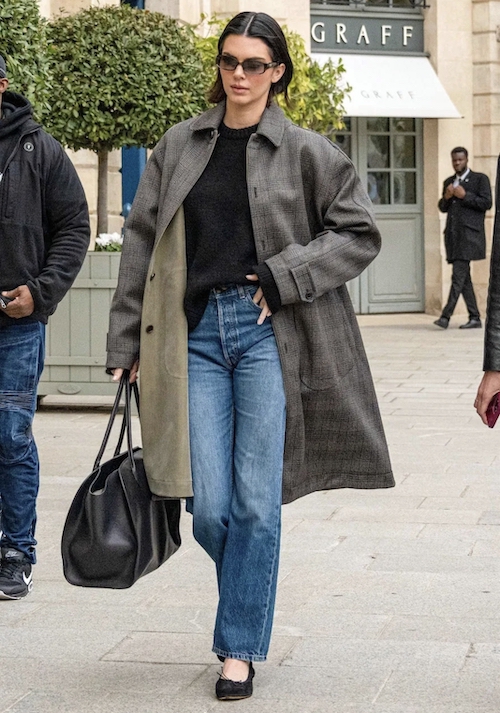 کندال جنر در پاریس با استایلی شیک و مدرن ظاهر شد: کت بلند چهارخانه، شلوار جین آبی، بلوز بافت مشکی و کفشهای بالهی مشکی از برند «The Row». این استایل نشاندهندهی ترکیب مدرن و کلاسیک است.