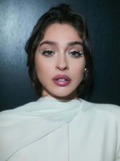 آنچه که این ظاهر را بیش از پیش خاص و بهیادماندنی کرده، آرایش چشم اوست. جمره با خط چشم نقرهای و درخشان، حالتی جسورانه و در عین حال جذاب به چشمهای خود بخشیده است. این آرایش براق و متفاوت، چهره او را با حالتی مدرن و جذاب به تصویر کشیده و به خوبی با سبک برند «ایو روشه» هماهنگ شده است. انتخاب این سبک آرایش، نه تنها نشاندهندهی اعتماد به نفس و جسارت جمره است، بلکه از مهارت او در تلفیق مد و زیبایی نیز حکایت دارد.