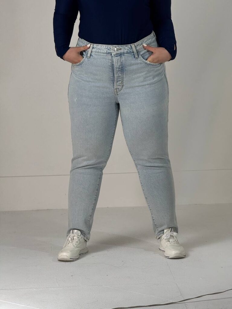 - فاق شلوار جین: شلوارهای جین فاق بلند، گزینهای بسیار مناسب برای خانمهای پلاس سایز هستند. این شلوارها به خوبی شکم و پهلوها را پوشش میدهند، فرم بدن را بهبود میبخشند و از ایجاد چین و چروک در قسمت کمر جلوگیری میکنند. فاق متوسط نیز در صورت انتخاب صحیح اندازه و مدل، میتواند مناسب باشد.