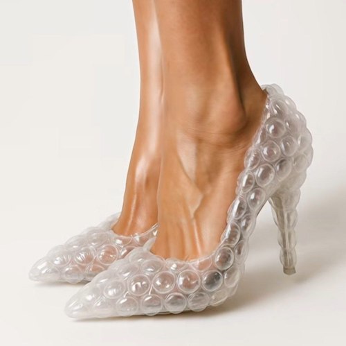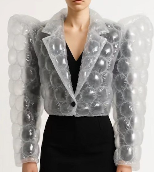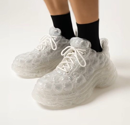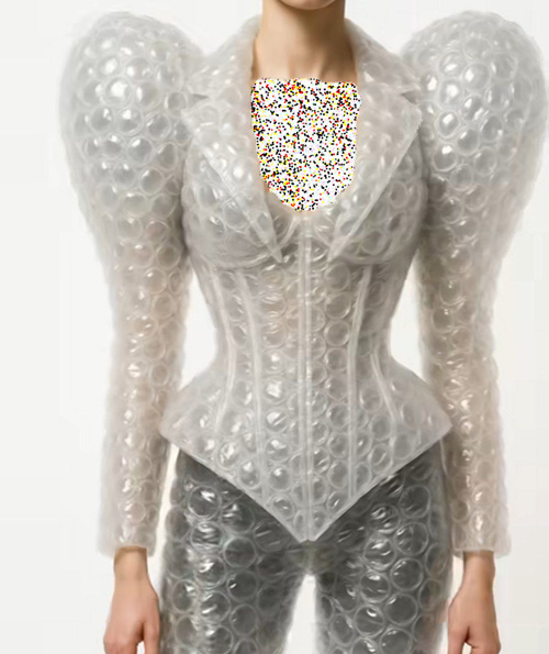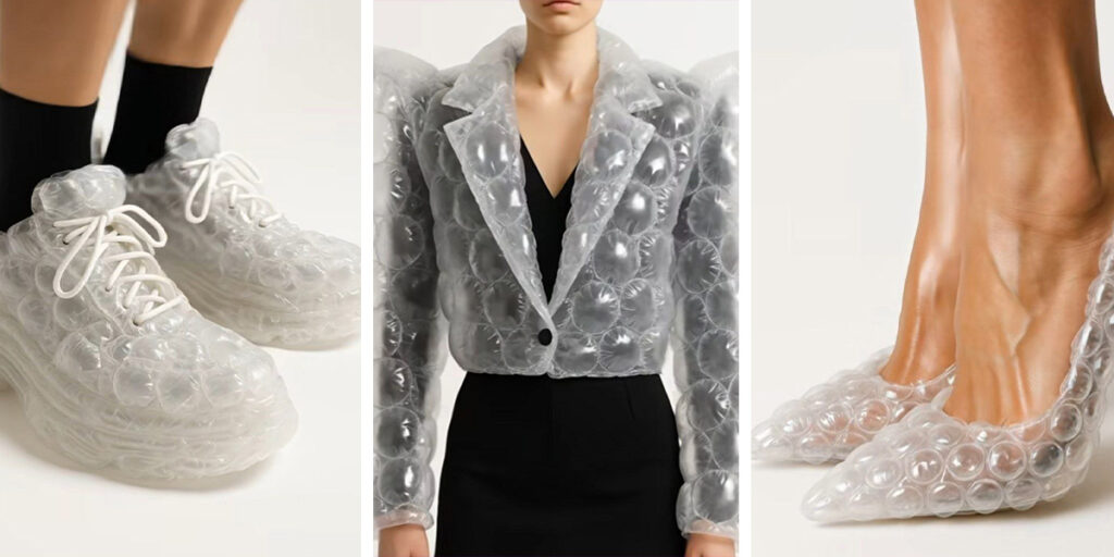 لباسها و کفشهای ساختهشده از ضربهگیرهای حبابی (Bubble Wrap)، اخیراً بهصورت تصاویری توسط هوش مصنوعی خلق شدهاند و در فضای مجازی بسیار مورد توجه قرار گرفتهاند. این آیتمها ظاهری بامزه، شفاف و پر از حبابهای آشنا دارند که یادآور پلاستیکهای بستهبندی هستند.