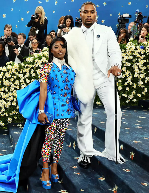 سیمون بایلز، ژیمناست معروف، به همراه همسرش جاناتان آونز با لباسهایی شیک و هماهنگ با تم در مراسم شرکت کردند. استایل آنها نشاندهندهی ترکیبی از ورزشکاری و شیکپوشی بود.