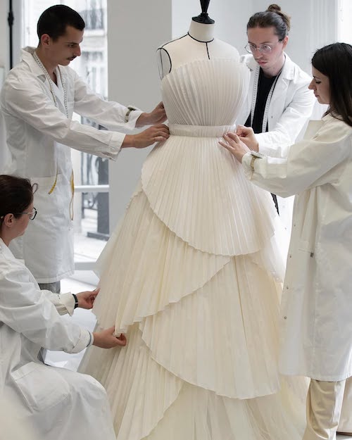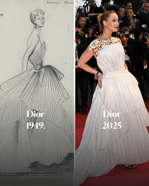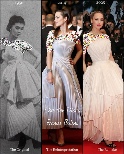 این لباس بیش از یک بار روی فرش قرمز جشنواره کن درخشیده است. ماریون کوتیار در سال ۲۰۱۴ نسخهای بازطراحیشده از آن را که توسط راف سیمونز خلق شده بود، به تن کرد؛ برداشتی مدرن با چینخوردگیهای زاویهدار و پژواکهای نرم و ملایم از نسخهی اصلی. ماریا گراتزیا کیوری نیز روح این لباس را در کالکشن اوت کوتور بهار ۲۰۱۷ دمید؛ در قالب لباسی با لایههای نامتقارن و نمادهایی درخشان که میان چینها پنهان بودند؛ گویی رازهایی که با حرکت لباس آشکار میشدند.