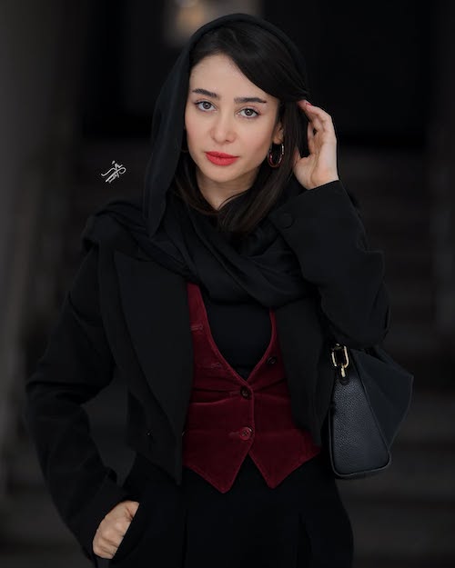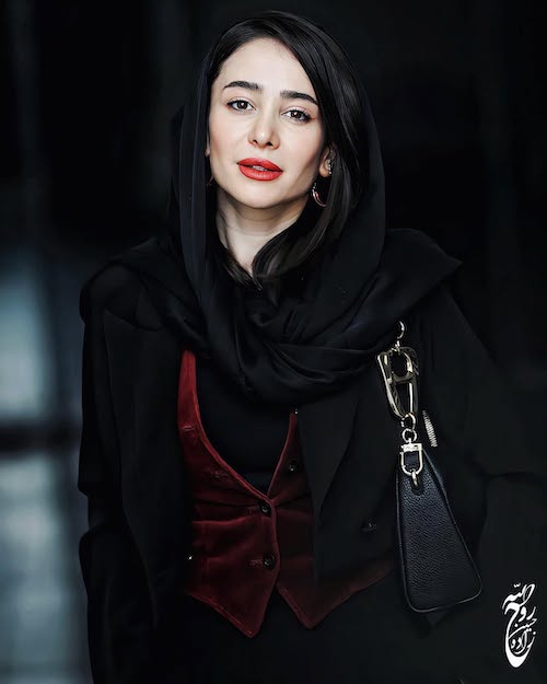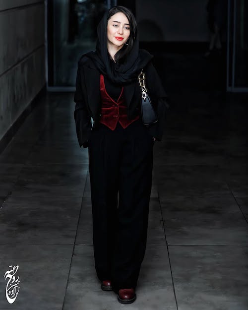 الناز تیپ از سر تا پا مشکی خود را با جلیقهای مخمل و زرشکیرنگ از یکنواختی خارج کرده بود. کفشهای زرشکی او نیز هماهنگی جالبی با جلیقهاش داشت. گوشوارههای حلقهای بزرگ، کیف مشکیرنگی از برند «نیمانی» و میکاپی با رژ لب قرمز و خط چشمی به همین رنگ، ظاهر این بازیگر را کامل کرده بودند. اگر الناز حبیبی سایز جلیقهاش را اندکی بزرگتر انتخاب میکرد، تیپی شکیلتر را میخواست.