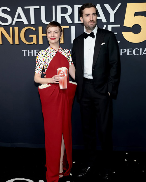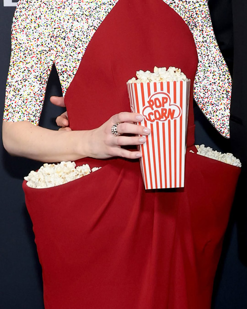 اما استون با لباسی خیرهکننده از برند «لویی ویتون» در این مراسم ظاهر شد که جیبهای آن با پاپکرن پر شده بود و یک جعبه پر از پاپکرن نیز در دستهای اما بود و استایلش را کامل میکرد. این انتخاب جسورانه و خلاقانه، توجه بسیاری از حاضران و رسانهها را به خود جلب کرد و نشاندهنده حس شوخطبعی و سبک منحصر به فرد او در مد بود. اما استون با این کار احتمالا میخواست علاقهی خود را به تماشای این شوی پرطرفدار آمریکایی نشان دهد و به همین سبب ظاهری آیکونیک را ساخت.
