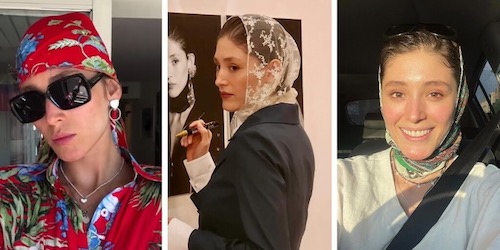 فرشته حسینی از اسکارف زیاد استفاده میکند و این اسکارفها را طوری به کار میگیرد که بهخوبی روحیه و موقعیتی که در آن حضور دارد را منعکس میکنند. برای مثال، در موقعیتهای عادی یا در یک استایل خیابانی ساده هم از اسکارف استفاده میکند و نوعی سادگی کودکانه و ملیح را به نمایش میگذارد. بسیار جالب توجه است که او توانایی به نمایشگذاشتن احساسات و شخصیتهای مختلفی با تیپ و استایل خود دارد. در تصویر بالا او را باز با یک اسکارف زیبا میبینید که با توجه به مدل موهایش واقعا تینیجری و دوستداشتنی شده است. معصومیت کودکانهای که او گاهی با وامگرفتن از عناصری پوششی مانند اسکارف به نمایش میگذارد، تاحدی یادآور ستارههایی مانند اودری توتو در امیلی پولن یا اودری هپبورن در بسیاری از فیلمهاست. البته قدرت بازیگری او زیاد است و توانایی ابراز حسهای دیگر هم در صورت و رفتارش دارد.