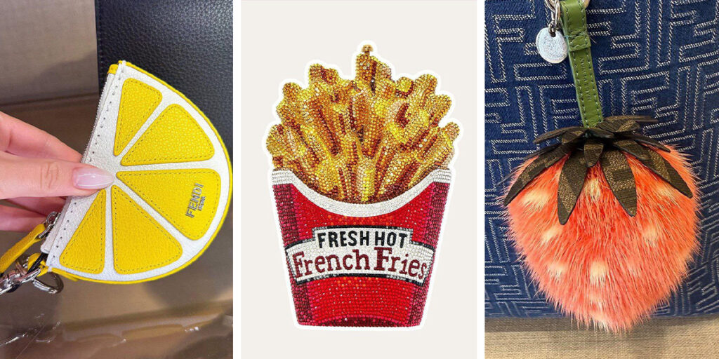 این اکسسوریها با فرمهای گرد، رنگهای شاد و درخشان و جزئیاتی شبیه به برگ یا پوست میوه، حال و هوایی بازیگوش و تابستانی به استایل میبخشند. برندهای خاص و حتی طراحان مستقل، از این طرحها برای ساخت کیفهای دستی، گوشوارهها و گردنبندهایی با حالوهوای فانتزی استفاده کردهاند. جذابتر از میوهها، الهام از خوراکیهایی مثل همبرگر، ساندویچ هاتداگ یا بستنیهای رنگارنگ نیز به طراحی کیفها و زیورآلات راه پیدا کردهاند. این آیتمها اغلب با نگینهای رنگی، کریستالها، پولکهای درخشان و سنگهای قیمتی به شکلی هنرمندانه تزئین میشوند تا هم حس شوخطبعی را منتقل کنند و هم درخشش بصری بالایی داشته باشند. چنین اکسسوریهایی نهتنها در مهمانیها و جشنهای خاص توجهها را جلب میکنند، بلکه نشاندهندهی جسارت در انتخاب و عشق به جزئیات فانتزی و متفاوت در استایل شخصی هستند.