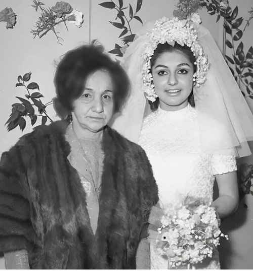 لباس عروسی او طراحیای کلاسیک و در عین حال منحصربهفرد داشت؛ با آستینهای کوتاه، یقهای بسته و پارچهای گیپور با طرحهای ظریف که بهصورت جذب دوخته شده بود و بهخوبی بر اندام او مینشست. این انتخاب، ترکیبی از سادگی، وقار و شیکپوشی بود که بهخوبی با شخصیت هنری و زیبایی طبیعی گوگوش همخوانی داشت. او این استایل عروس را با توری ساده اما تأثیرگذار کامل کرده بود؛ توری که با تاجی از گلهای کوچک و سفیدرنگ تزئین شده و حالوهوایی شاعرانه و لطیف به ظاهرش بخشیده بود. این جزئیات، تصویری بهیادماندنی از یکی از چهرههای مهم موسیقی ایران در یکی از لحظات مهم زندگیاش خلق کردند. استایل عروسی گوگوش، بازتابی از سلیقهی ظریف و سبک شخصی او در آن دوران بود؛ سبکی که هنوز هم برای بسیاری الهامبخش و قابل توجه است. مادر محمود قربانی نیز در این عکس در کنار گوگوش دیده میشود.