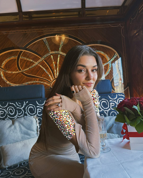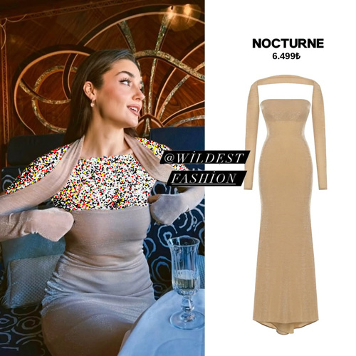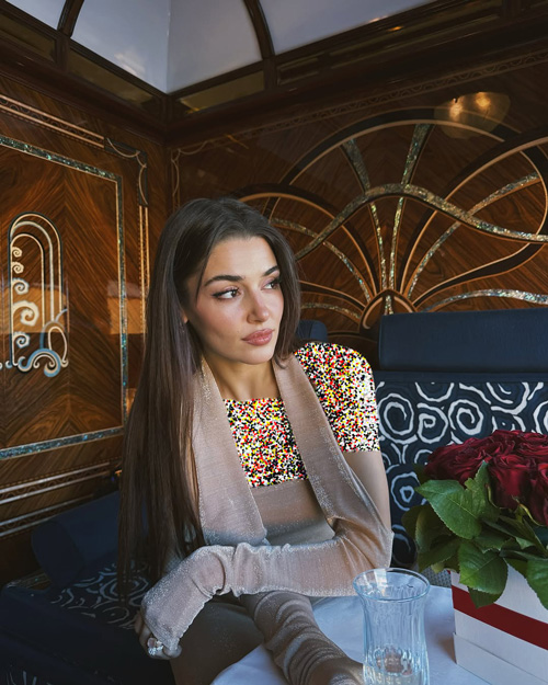 این ستاره ۳۱ ساله که این روزها همراه با پارتنرش هاکان سابانجی در حال اروپاگردی است، به تازگی تصاویری را از کوپه خصوصی و مجلل یک قطار منتشر کرد که در آنها با پیراهنی جدید از برند «نوکتورن» دیده میشود. این پیراهن دکلته با بخشی جداگانه که آستینهای لباس را تشکیل میدهد، کامل شده است.