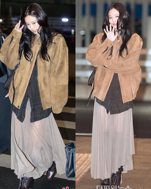 دیروز، او با یک استایل لایهلایه و منحصر به فرد دیده شد. او دامن حریر و چیندار بلند به رنگ کرمی را به همراه شومیز فلانل چهارخانه به تن داشت که ترکیبی جذاب و چشمگیر را ایجاد کرده بود. به علاوه، کت جیر شتریرنگ و کیف و بوتهای بلند به رنگ قهوهای سوخته، ظاهر او را تکمیل کرده بودند و همگی به طور همزمان حسی شیک و غیررسمی را به نمایش میگذاشتند. این ترکیب لایهای اگرچه استایلی شیک ایجاد کرده بود، اما در عین حال اندکی شلخته به نظر میرسید. به عبارت دیگر، در این استایل جنی، تعادلی ظریف میان راحتی و روی مد بودن برقرار بود، اما شاید کمی از دقت و نظم آن کاسته شده بود. با این حال، جنی توانسته بود این استایل را به خوبی با شخصیت خود وفق دهد و همچنان به عنوان یک نماد از مد و جذابیت در کانون توجه باقی بماند.