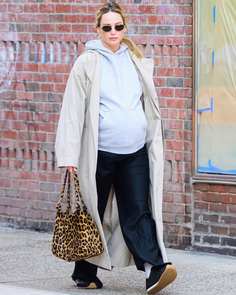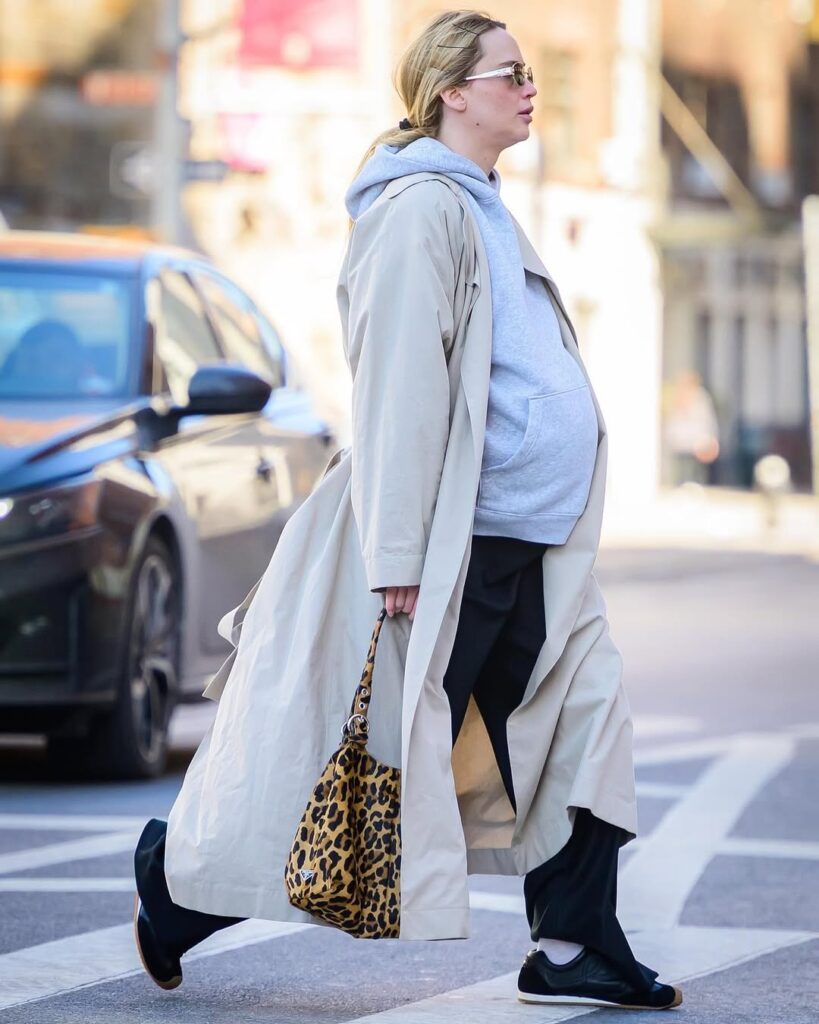 بهتازگی، لارنس در یکی از تیپهای خیابانیاش با پوشیدن هودی ساده، شلوار مشکی و ترنچکتی بلند و استخوانیرنگ به جلوهای جذاب و در عین حال راحت دست یافته است که نشان میدهد او حتی در دوران بارداری نیز میتواند استایلی شیک و متناسب با وضعیت خود پیدا کند. این استایل با انتخابهای هوشمندانهاش تکمیل میشود، از جمله کیف پلنگی که تنوعی خاص به تیپ او بخشیده و همچنین کفشهای اسپرت که هم راحت و هم شیک هستند. جنیفر لارنس بهخوبی نشان میدهد که حتی در دوران بارداری نیز میتوان استایلی بینقص و متفاوت داشت. او با انتخابهای خود ثابت کرده است که استایل خیابانی میتواند هم راحت و هم شیک باشد و هیچ وقت از نظر مد عقب نمیافتد.