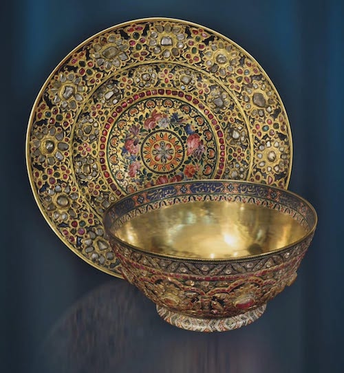 این کاسه و بشقاب از طلای ناب ساخته شده و با سنگهای یاقوت و لعل و زمرد میناکاری تزئین شدهاند. این ظروف زرین به مناسبت پیروزی سپاه ناصرالدین شاه ساخته شده و به او هدیه داده شد. در کف کاسه یک تکه زمرد ۱۱۰ قیراطی در میان یک خورشید کار شده و زیبایی مجموعه را دوچندان کردهاست.