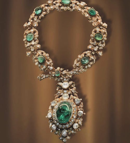 این قطعه از ترکیب طلا و الماس ساخته شده و با زمردهای سبز رنگ و درخشان تزئین شده است. این زنجیر هدیهی کسرائیل خانم یا بانو عظمی به پدرش ناصرالدین شاه بوده و ۱۴۵.۳ گرم وزن دارد.
