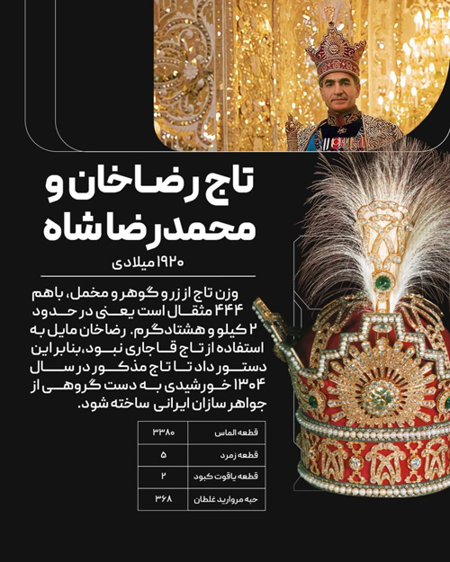 این تاج به دستور رضاشاه پهلوی در سال ۱۳۰۴ خورشیدی (۱۹۲۶ میلادی) طراحی و ساخته شد چرا که او مایل به استفاده از تاجهای قاجاری نبود. برخلاف تاجهای قدیمیتر که تزئینات سنگین و پیچیده داشتند، این تاج سادهتر ولی بسیار شکوهمند است. بر روی تاج، الماسها، یاقوتها، زمردها و مرواریدهای گرانبها کار شده است. این تاج بعدتر بر سر محمدرضاشاه پهلوی نشست.