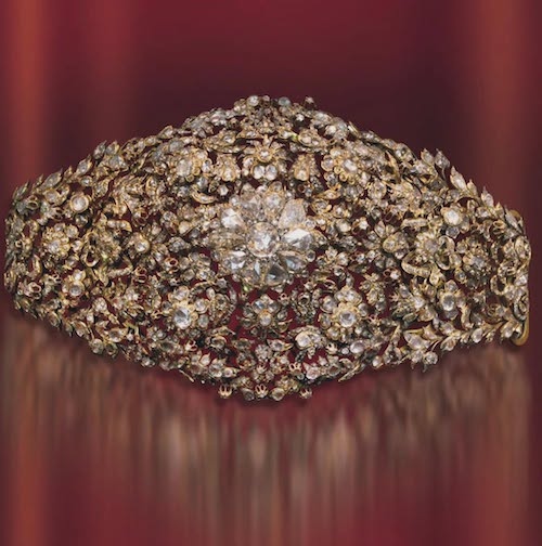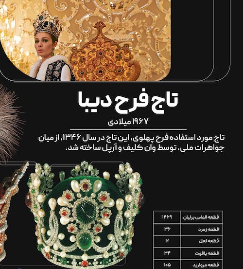 این تاج ویژه برای مراسم تاجگذاری فرح دیبا، همسر محمدرضا شاه، ساخته شد. طراحی آن توسط شرکت «وان کلیف و آرپلز» فرانسوی انجام شد و با الماسها و زمردهای درخشان تزئین شده است. این تاج سبکی مدرن دارد و با ذوق و سلیقهی خاصی طراحی شده تا فرح دیبا در مراسم تاجگذاری جلوهای خیرهکننده داشته باشد.