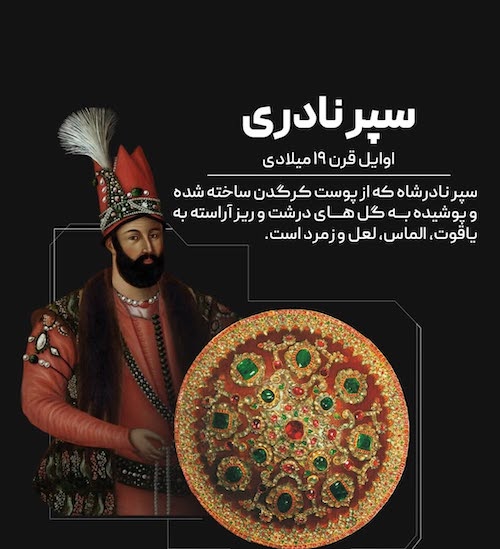 سپر نادری یکی از آثار منحصر بهفرد خزانه است که از طلا ساخته شده و با جواهرات رنگارنگ همچون یاقوت، الماس و زمرد تزئین شده است. این سپر به نادرشاه افشار منسوب است و نمادی از قدرت نظامی و ثروت او به شمار میرود.