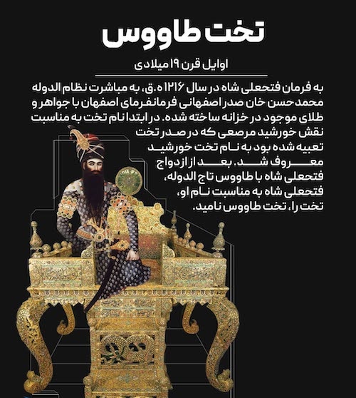 تخت طاووس یا تخت خورشید یکی از مشهورترین آثار خزانه است. این تخت از طلا و نقره ساخته شده و با جواهرات گرانبهایی همچون زمرد، یاقوت و مروارید تزئین شده است. این تخت در دوران قاجار ساخته شد و نماد شکوه و جلال دربار ایران است.