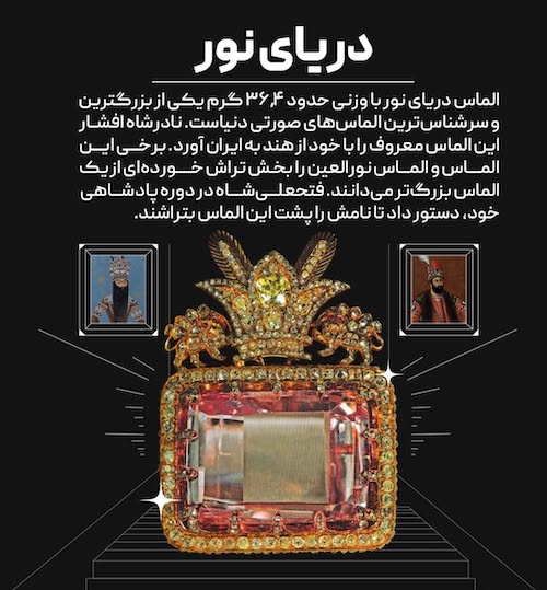 دریای نور یکی از بزرگترین و مشهورترین الماسهای صورتی جهان است که در خزانه جواهرات ملی ایران نگهداری میشود. این الماس بینظیر از هند به ایران آمده و دارای رنگی منحصر بهفرد و درخشندگی فوقالعاده است. دریای نور نماد ثروت و عظمت شاهان ایران بوده است.