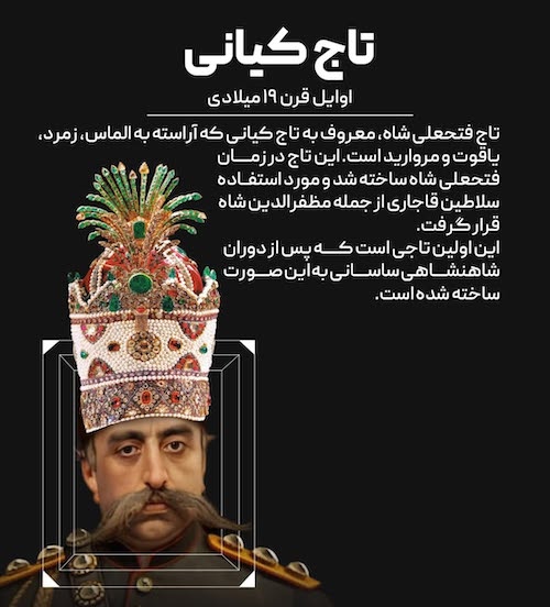 تاج کیانی متعلق به دوران قاجار است و طراحی آن بر اساس سبکهای ایرانی و سنتی انجام شده است. این تاج با الماسها، زمردها و یاقوتهای فراوان تزئین شده و نمادی از قدرت و سلطنت پادشاهان قاجار به شمار میآید.