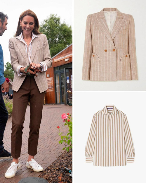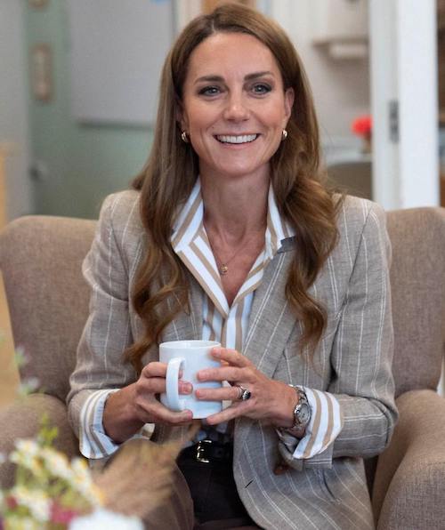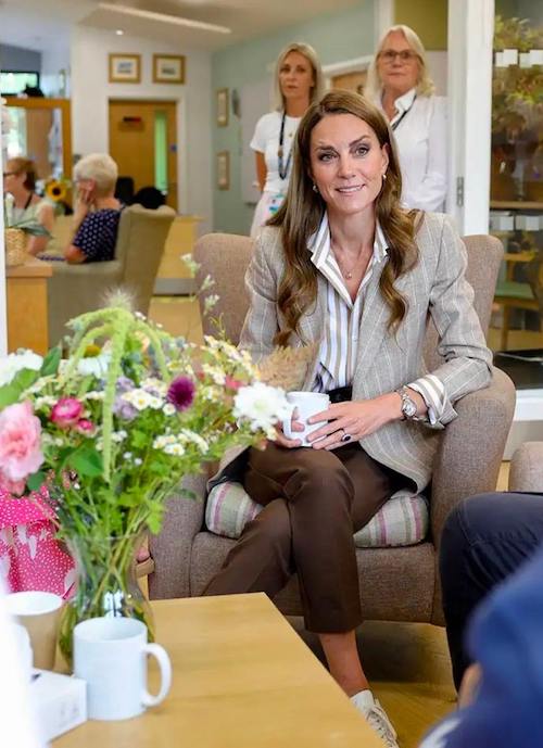 او در تاریخ ۲ ژوئیه (۱۱ تیر) به این بیمارستان در شهرستان اسکس رفت تا از باغ مخصوص ارتقا روانی بیماران، کارکنان خدمات سلامت و بازدیدکنندگان دیدن کند. شاهزاده ولز در گفتوگویی صمیمی گفت: «در طول درمان، چهرهای شجاع و صبور به خود میگیرید. وقتی درمان تمام میشود، انتظار دارید زندگی به حالت عادی برگردد؛ اما واقعیت این است که آن مرحله بعد از درمان واقعا سخت است.» او در این دیدار با استایلی اسمارت کژوال دیده شد که با یک کت قهوهای دو دکمهای از «بلِیز میلان» (Blazé Milano) و با راهراههای سفید تکمیل شده بود. شومیز راهراه سفید و نخودی کیت از برند «رالف لورن» در زیر این کت نه تنها تیپش را شلوغ نکرده بود، بلکه نشان داد که انتخاب درست رنگ و طرح راهراهها میتواند ظاهر بسیار دلنشین و جذابی را به ارمغان بیاورد و همچون همیشه الهامبخش و خیرهکننده باشد. پرنسس ولز برای حفظ راحتی در محیط غیررسمی بیمارستان، کتانیهای چرمی از «وِژا» (Veja) به پا داشت. جواهرات انتخابی او شامل گردنبند سنگ ماه تولد، گوشواره و ساعت مچی «کارتیه» بود.