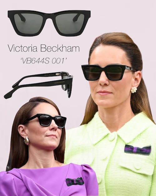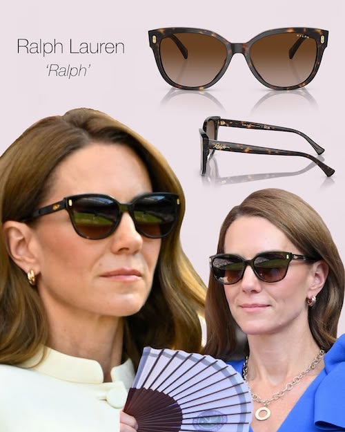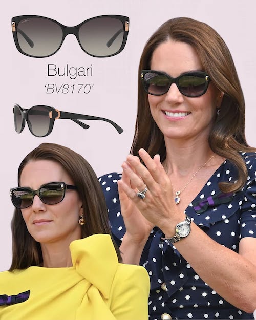 کیت بسیار آگاهانه عینک آفتابی خود را با نوع رویداد، لباس و سبک آرایشش هماهنگ میکند. برای حضور در فضاهای باز، مانند مسابقات ورزشی (از جمله مسابقات تنیس و رویدادهای Royal Ascot)، او از عینکهایی با فریمهای بزرگتر و تیرهتر استفاده میکند که هم از چشمها محافظت کند و هم جلوهای شیک به چهره ببخشد. او در رویدادهای خانوادگی یا موقعیتهای غیررسمی، ممکن است از فریمهای ظریفتر و رنگهای گرمتری استفاده کند تا حس دوستانهتری به ظاهرش ببخشد.