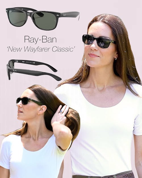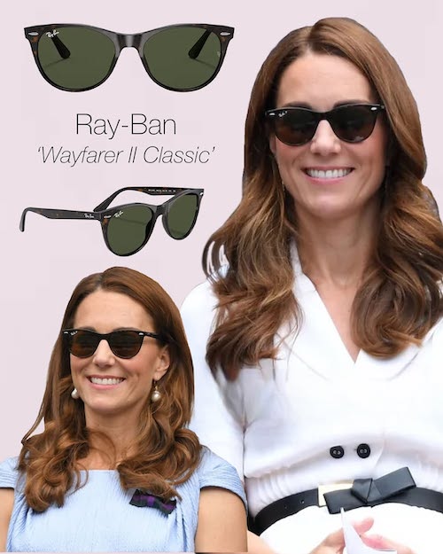 ری-بن – یکی از محبوبترین انتخابهای کیت، بهویژه مدل Wayfarer Classic که بارها در رویدادهای غیررسمی با آن دیده شده است.