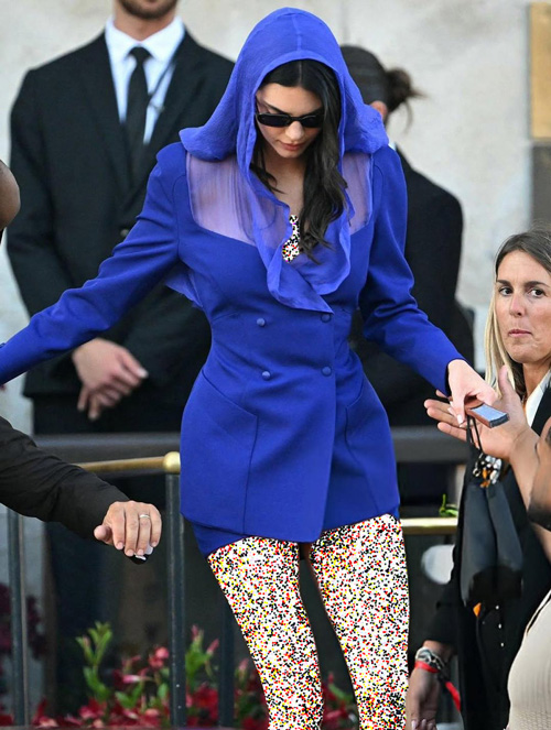 حضور این سوپرمدل در مهمانی پس از عروسی، با یک استایل خاص و مدرن، نشاندهندهی نگاه متفاوت او به ترکیب آیتمهای کلاسیک و خلاقانه در پوشش بود. در گشتوگذار شهری در ونیز و همچنین در ادامهی مراسم، کندال با کت بلند آبی کاربنی ظاهر شد که شال تور و حریر به آن متصل شده بود؛ ترکیبی از ساختار و سیالیت که استایلی دراماتیک، مجلل و مدرن به وجود آورده بود. این انتخاب، تضاد زیبایی میان فرم رسمی کت و لطافت متریال شال بهوجود آورد و مورد تحسین بسیاری از منتقدان مد قرار گرفت. استایل جدید کندال جنر نشان میدهد که او همچنان یکی از پیشگامان ترندهای نو در دنیای فشن باقی مانده و توانایی ترکیب عناصر کلاسیک با جزئیات نوآورانه را بهخوبی در اختیار دارد.