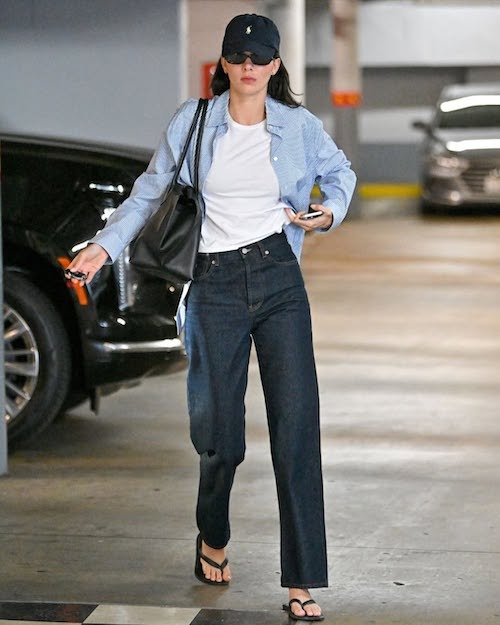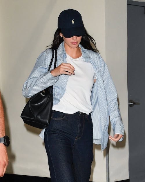 این ستارهی خوشپوش، اخیرا با استایلی راحت و تابستانی دیده شده که منبع الهام خوبی برای ساخت تیپهای خنک در روزهای گرم است. او شومیز راهراه آبی و سفید که در یک سال اخیر بسیار ترندی و پرطرفدار بوده و همچنان نیز محبوب است را با شلوار جین راسته و سرمهایرنگ همراه نمودهاست. تیشرت سفید، دمپایی لاانگشتی مشکی و کلاه کپی به همین رنگ، استایل جدید کندال را کامل کردهاند. او کیف مشکی و بزرگی را نیز به دوش دارد.