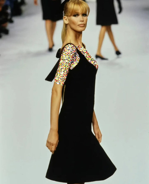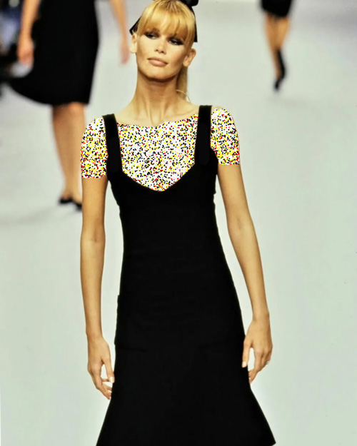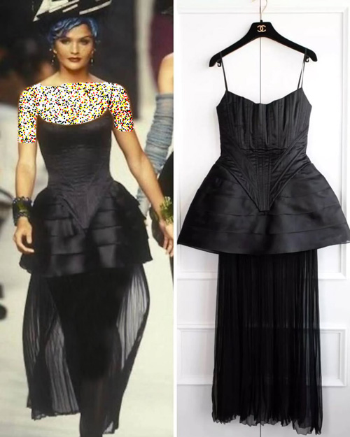 او لباسی از مجموعهی فاخر پاییز و زمستان ۱۹۹۲ «شنل» و از طراحیهای هنرمند فقید، کارل لاگرفلد را به تن کرد که از ساتن مشکی و با کرستی ظریف طراحی شده بود. این لباس در بازار کالاهای لوکس دستدوم حدود ۵۰ هزار دلار معادل 5 میلیارد تومان قیمت دارد. کیم، علاوه بر این لباس خاص، از روند زیبایی محبوب در دهه ۹۰ میلادی الهام گرفت. مدل موهای او که با پاپیونهای مشکی تزیین شده بود، ادای احترامی به سبک آرایش نمادین کلودیا شفر در کتواک فشنشوی مجموعهی پاییز ۱۹۹۵ «شنل» بود. این مدل مو که با استفاده از موی مصنوعی برای کیم اجرا شده بود، یکی از محبوبترین سبکهای زیبایی در این فصل محسوب میشود.