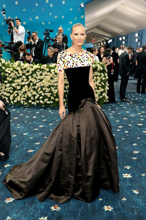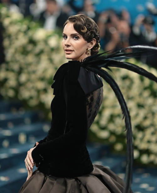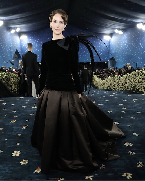لانا دل ری با انتخاب پیراهنی از برند «ولنتینو»، جلوهای دراماتیک و شاعرانه به سبک خود بخشید. بالاتنهی مشکی و ساده با آستین بلند و یقه بسته، نشانهای از حجب و وقار کلاسیک داشت، اما پشت این لباس با تور طرحدار بهطرز هوشمندانهای تکمیل شده بود که لایهای از لطافت و پیچیدگی را به لباس اضافه میکرد. جزئیاتی همچون پاپیون روی سرشانه این لباس که به زائدههایی در پشت ختم میشد، حالتی روایی و نمایشی به ظاهر او میداد. دامن پرچین و پفدار ساتنی، تضادی چشمگیر با سادگی بالاتنهی لانا ایجاد کرده و شکوهی شاهانه به استایل او بخشیده بود.