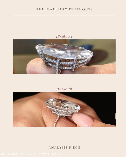 اما حلقهدوم که گمان میرود نسخه ارتقاءیافتهی حلقهی نامزدی باشد، دارای یک الماس سفید با تراش بیضی (Oval Cut) است که وزن تقریبی آن بین ۳۰ تا ۴۰ قیراط برآورد میشود. این سنگ گرانبها در پایهای چهارچنگکی از پلاتین یا طلای سفید قرار گرفته و طراحی آن شامل سبد دوبل الماسنشان و هالهای مخفی (Hidden Halo) است.