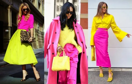 اگر همچنان میخواهید بدانید رنگ سرخابی با چه رنگی ست میشود بهتر است رنگ زرد را امتحان کنید. رنگهای سرخابی و زرد هر دو در دسته رنگهای گرم قرار گرفته و به تنهایی توجهها را به سمت خود جلب میکنند. اما زمانی که با هم ترکیب شوند، اثری دوچندان خواهند داشت. این ترکیب به دلیل تضاد پرجنبوجوش میان این دو رنگ و جذابیت بالا، به انتخابی فوقالعاده تبدیل میشود. هر دو رنگ سرشار از انرژی و نشاط هستند. سرخابی حس شور و جسارت را منتقل میکند و زرد نمادی از خوشبینی و شادابی است. کنار هم این دو رنگ، تصویری پر از زندگی و حرکت خلق میکنند. ترکیب سرخابی و زرد، چشمگیر، جسورانه و خاص است. اگر دوست دارید در میان جمع دیده شوید، این ترکیب برای شما مناسب است. این ترکیب، با حس شادابی و نور، در فصلهای بهار و تابستان بیشترین جلوه را دارد و با طبیعت پر اشعهی خورشید هماهنگ است. این ترکیب جذاب را میتوان به اشکال زیر به کار برد: