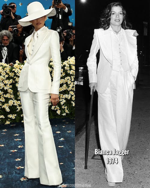 زندایا در اوتفیتی از «لوییویتون» مشابه با استایل بیانکا جگر در سال ۱۹۷۴