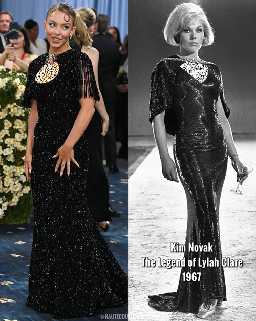 سیدنی سوئینی با لباسی از «میومیو» مشابه با استایل کیم نواک در سال ۱۹۶۷
