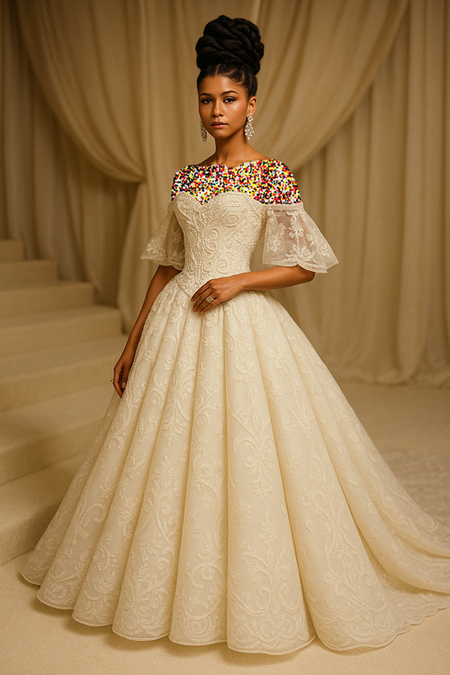 او ممکن است لباسی بپوشد با سیلوئتهای دراماتیک (مانند دنبالههای بلند یا ساختارهای مجسمهای) که با متریالهای ظریف مثل ابریشم، حریر یا تور و جزئیات سنتی مانند دوخت دست، گلدوزی با الهام از هنرهای آفریقایی و موتیفهای قومی سیاهپوستان تزئین شده باشد.