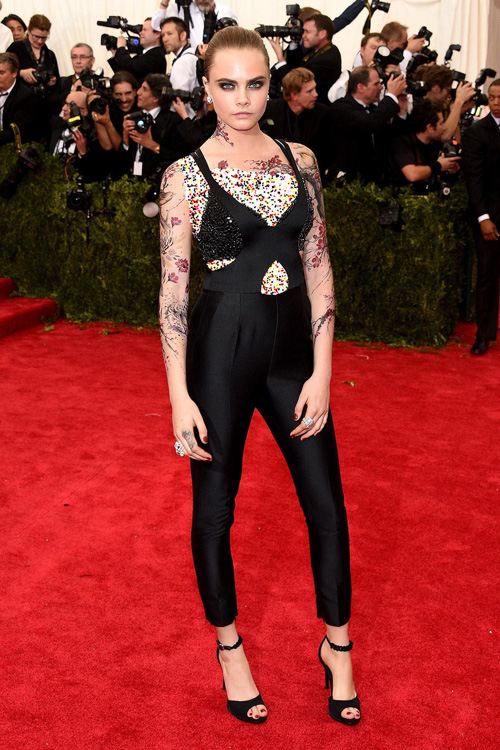 کارا دلواین با نگاهی مدرنتر به تم مت گالا ۲۰۱۵ نزدیک شد. او سرهمی مشکیرنگی شامل تاپ و شلوار جذب از برند «استلا مککارتی» انتخاب کرده بود و بازوهای خود را با خالکوبیهای موقت از طرحهای اژدهای چینی پوشانده بود. این ظاهر بدون استفاده مستقیم از لباسهای سنتی، احترامی مفهومی و خلاقانه به فرهنگ چین نشان میداد و استایلی منحصر به فرد برای او رقم زد.