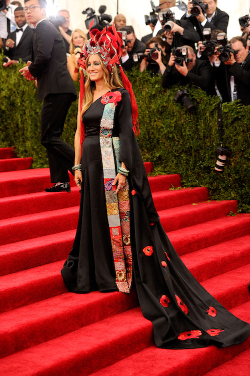 سارا جسیکا پارکر نیز با انتخابی بسیار خلاقانه ظاهر شد. او لباس مشکی و قرمزی از برند «H&M» بر تن داشت که با یک هدپیِس چشمگیر از «فیلیپ تریسی» کامل شده بود. هدپیسی که با شعلههای قرمز طراحی شده بود، به طرز هوشمندانهای به افسانههای چینی و عنصر آتش در فرهنگ شرق اشاره میکرد و یکی از هنریترین و بحثبرانگیزترین آیتمهای آن شب بود.